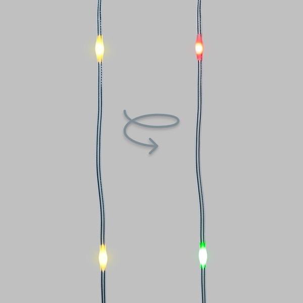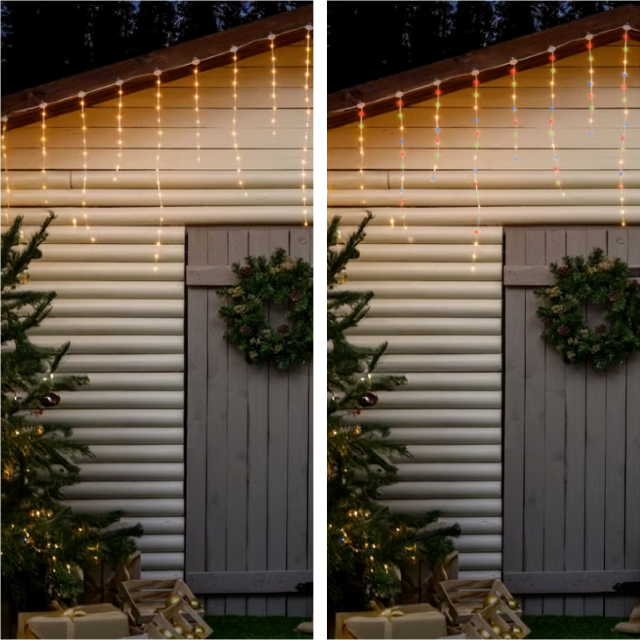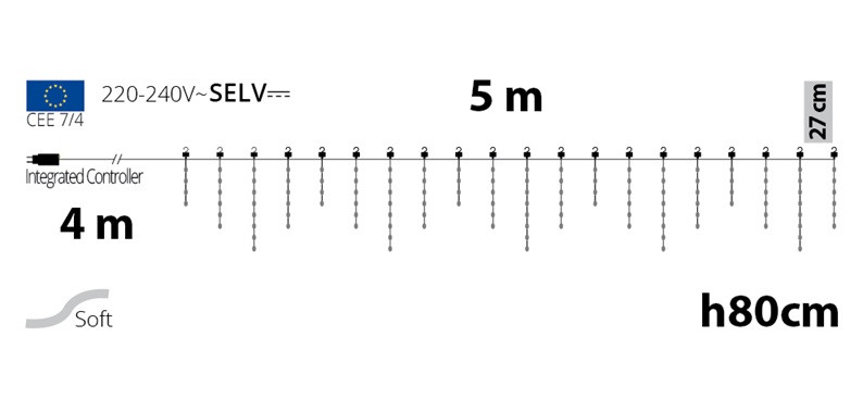 Ice Light 500xH80cm 120 SMD Dual Color LED BIANCO CALDO e MULTI ø4mm, Led High Brightness alta luminosità a 360°, Memory Controller Multifunzione con Timer 8 ore On (16 ore Off) disinseribile tramite Pulsante Luminoso integrato nel Trasformatore SELV di Sicurezza, dotata di Ganci per appenderla, IP44 uso Esterno e Interno, Cavo Soft Trasparente, Cavo di Alimentazione 4m, Dimensioni 4m+500xH80cm, Scatola lusso color