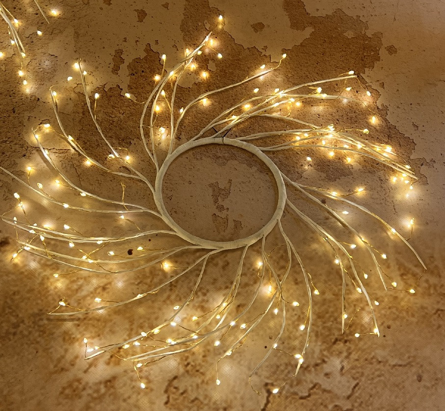 Corona di Rami TIGLIO Bianco ø45cm 160 MicroLED BIANCO CALDO ø1,5mm, Long Leg Led con gambo di 3cm, Cavo Metallo Argento Metal Silver, gioco di luce automatico FlashLED Diamond (144 led a luce fissa + 16 led Flash con lampeggio veloce), Trasformatore SELV di sicurezza, IP44 uso Esterno e Interno, Appendibile e da appoggio, Cavo di Alimentazione Trasparente 5m