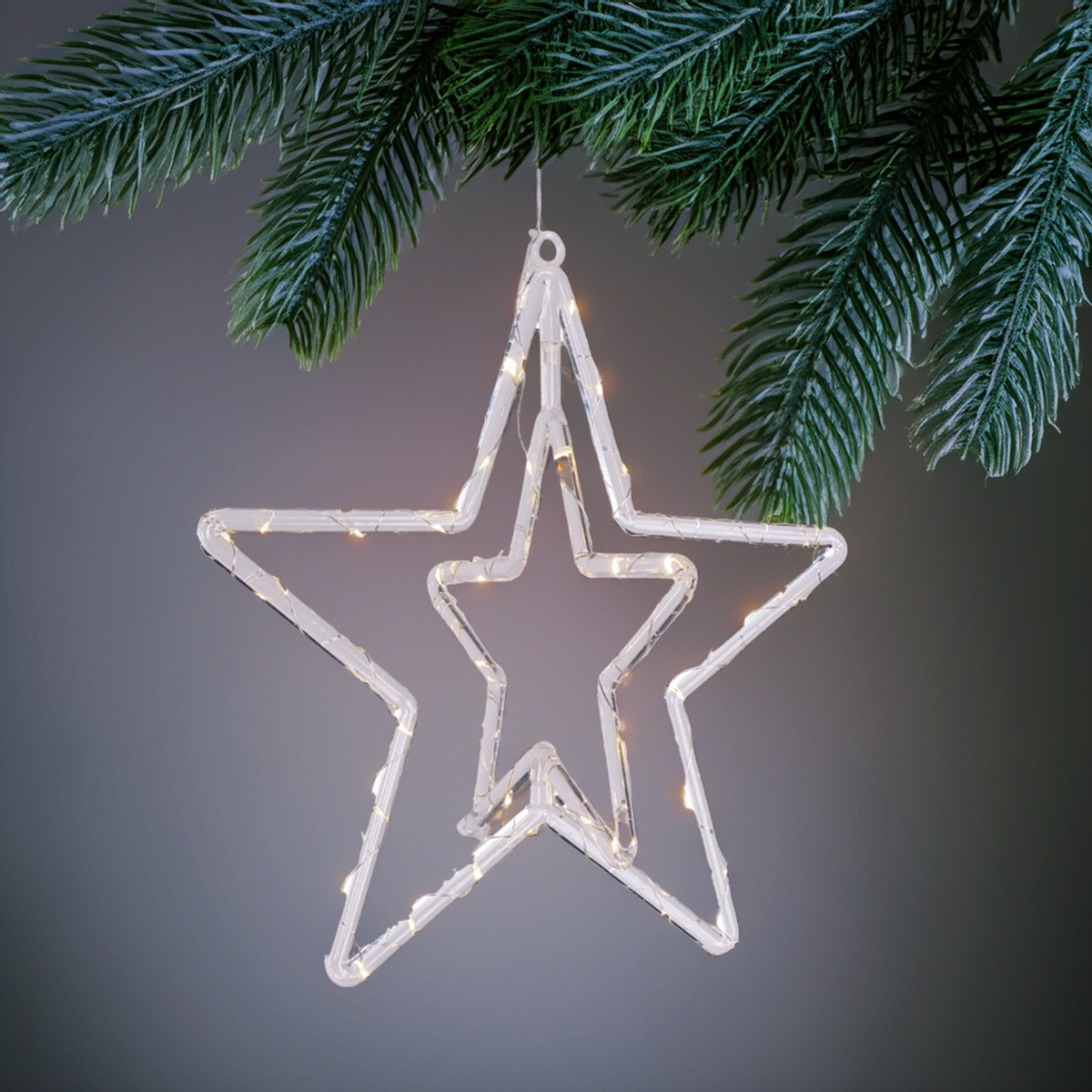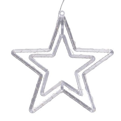 Stella Doppia ø35cm PGS in plastica Crystal illuminata da 50 MicroLED BIANCO CALDO a Luce Fissa, Timer Giornaliero 8 ore On (16 ore Off), porta batterie IP44 con pulsante 3 funzioni Timer - On - Off, a Batteria 3xAA 1,5V, IP20 uso Interno e Portatile, Cavo Alimentazione Trasparente 100cm con Gancio regolabile per appendere incluso