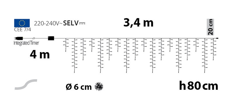 Ice Cluster Light 340xH80cm 18 Stringhe ø6cm SFL StarFall Light Steady + Chasing 576 LED BIANCO CALDO e BIANCO, 384 LED B.Caldo ø5mm Reflex a Luce Fissa + 192 SMD LED B.Freddo con Memory Controller Luce Fissa + Effetto Rincorsa a 7 velocità, Timer Giornaliero 8 ore On (16 ore Off) disinseribile tramite Pulsante Luminoso 3 funzioni On-Timer-Off integrato nel Trasformatore SELV di sicurezza, Scatola lusso color
