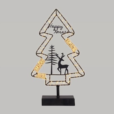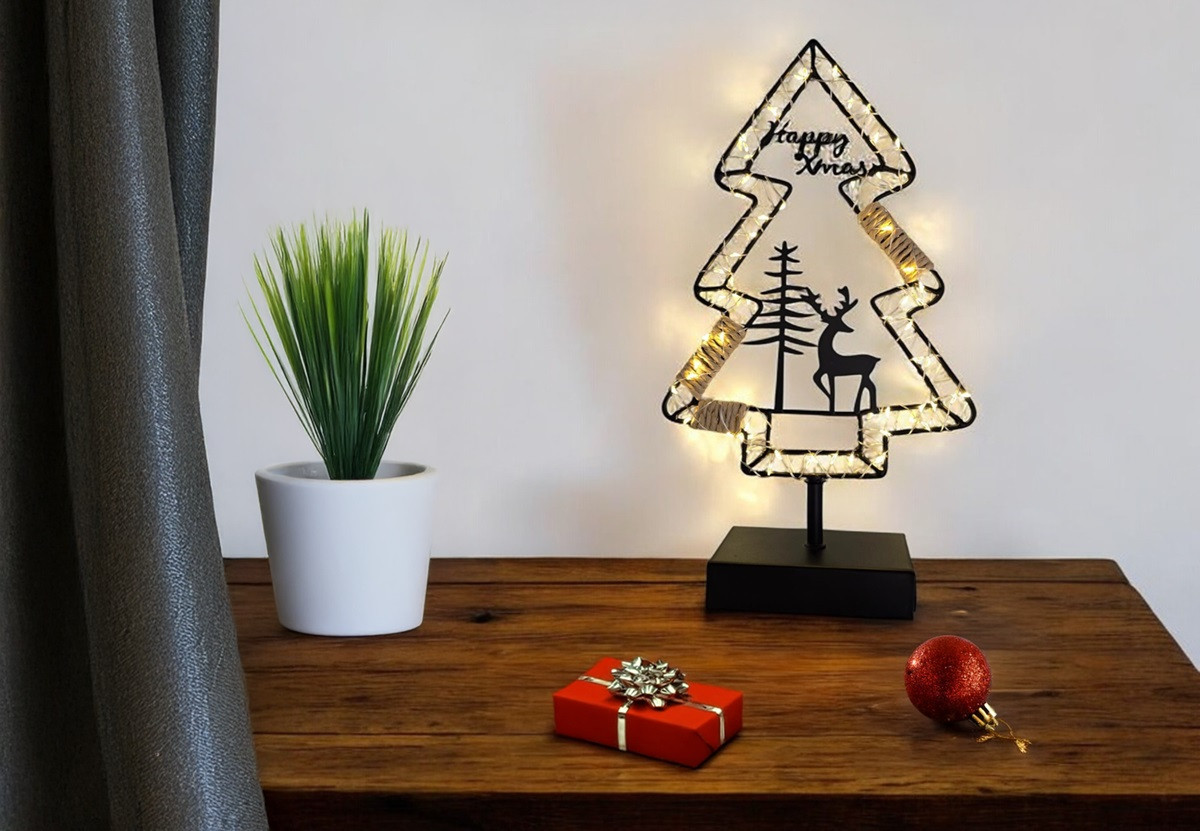 Decorazione Xmas Tree Albero con Base H35cm serie MPK Metal & Paper Rope in Metallo Nero illuminata da MicroLED BIANCO CALDO, Luce Fissa, Timer Giornaliero 8 ore On (16 ore Off) escludibile con selettore Off-Timer-On, a Batteria 2xAA 1,5V (non incluse), Porta Batterie Integrato, uso Interno Portatile